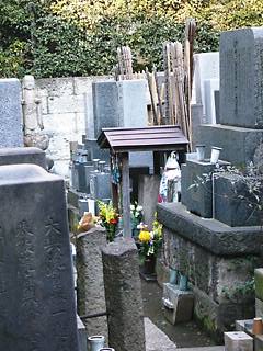 | 桜川神社の向かいに位置するのが、 沖田総司の菩提寺である専称寺。 非常に小さなお寺である。 お寺の裏に小さな墓地があり、 その中に沖田総司のお墓もある。 が、現在は一年に一回 総司忌の時にしか、 一般に公開されていない。 赤い屋根のついたお墓が、 総司のお墓とのこと。 |